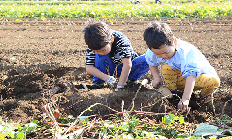 隣接する畑での土づくりから体験し、 農作業の大変さや農家さんの思いに触れ、 食に親しむ気持ちを育くみ、 「いただきます。」の本来の意味を知ってほしい。